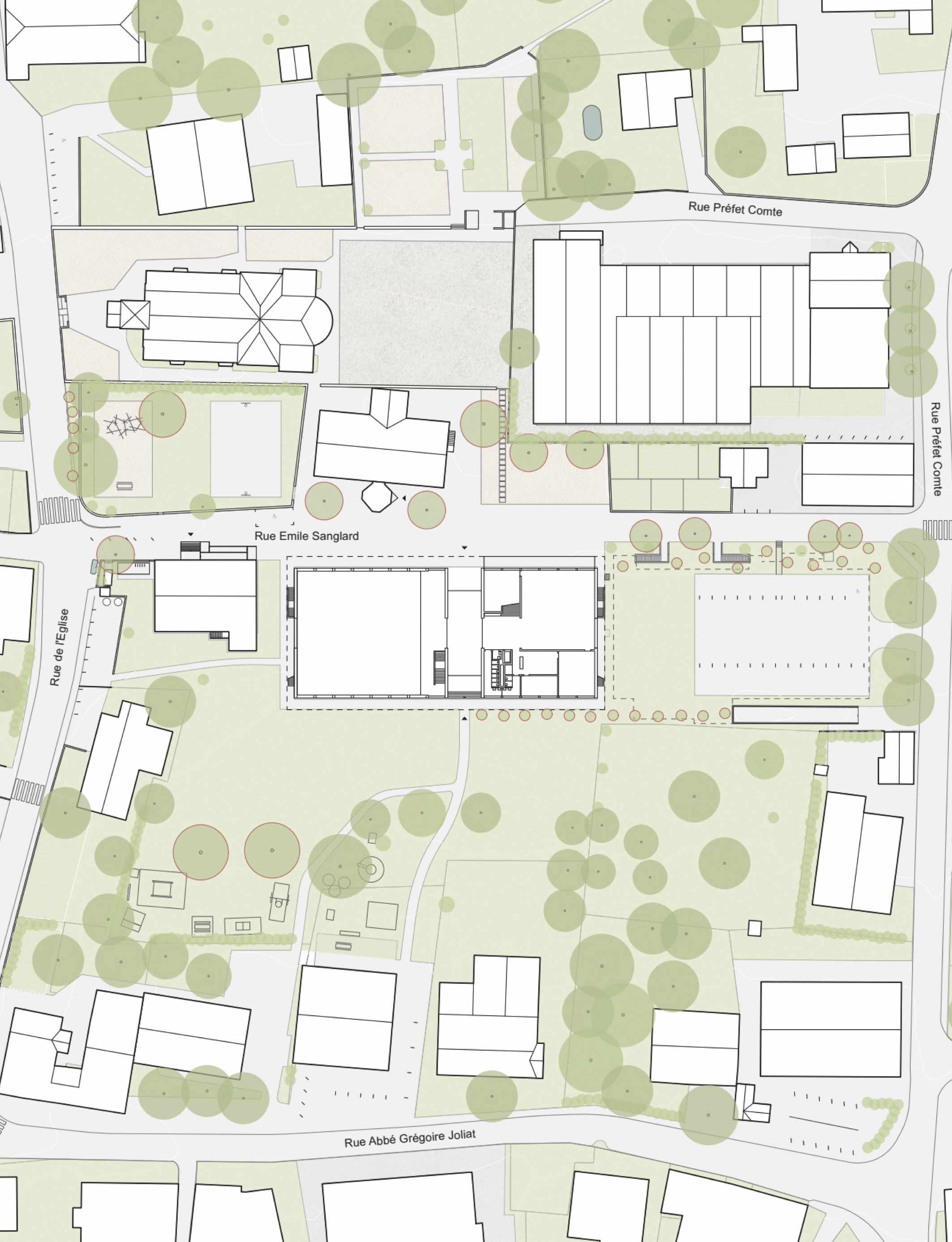 Les deux parties du bâtiment seront accessibles par le préau couvert qui reliera la rue Emile Sanglard aux espaces verts adjacents. Le rez-de-chaussée abritera la salle des maîtres, le bureau de la direction ainsi qu’une salle polyvalente qui pourra également être utilisée pour des événements extrascolaires.