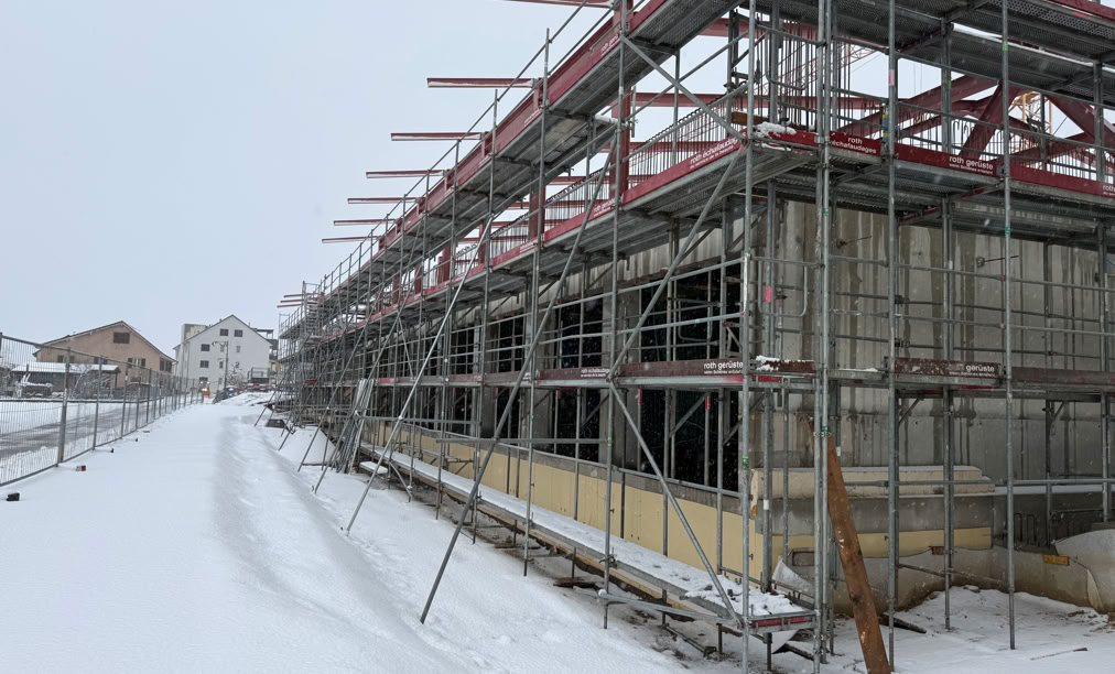 Les impressionnantes poutres métalliques du nouveau complexe scolaire ont été posées sur les murs porteurs du bâtiment. Pour cette opération spectaculaire, l’entreprise Gyger a mobilisé l’une de ses plus grandes grues, équipée d’un mât télescopique culminant à 85 mètres. Capable de soulever jusqu’à 450 tonnes, l’engin a manœuvré avec une précision remarquable, permettant notamment de déposer sans difficulté les deux poutres principales de 20 tonnes qui couvriront la double salle de sport.