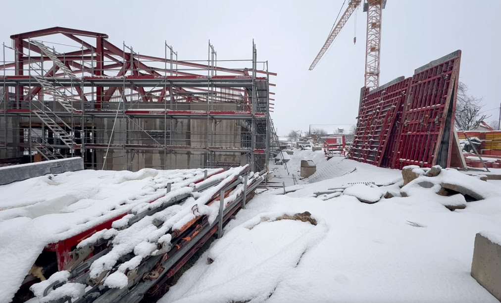 C'est un bâtiment enveloppé d'une belle couche de neige qui se présentait ce matin aux ouvriers pour la réouverture du chantier. L'installation des tôles d'acier profilées qui serviront de coffrage et d'armature du premier étage se poursuivra ces prochains jours dans des conditions un peu moins favorables qu’en décembre dernier. En principe, les murs et la dalle du premier étage devraient être bétonnés au début du mois de février. Si le planning est respecté, le bâtiment devait être mis hors d’eau en mars.
