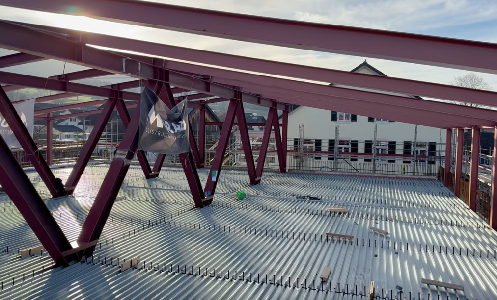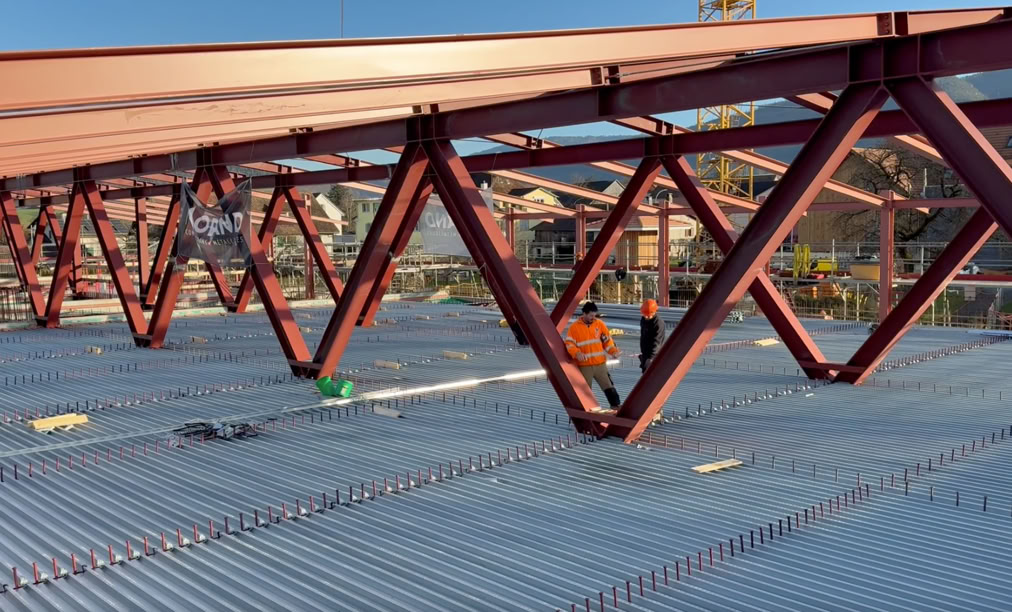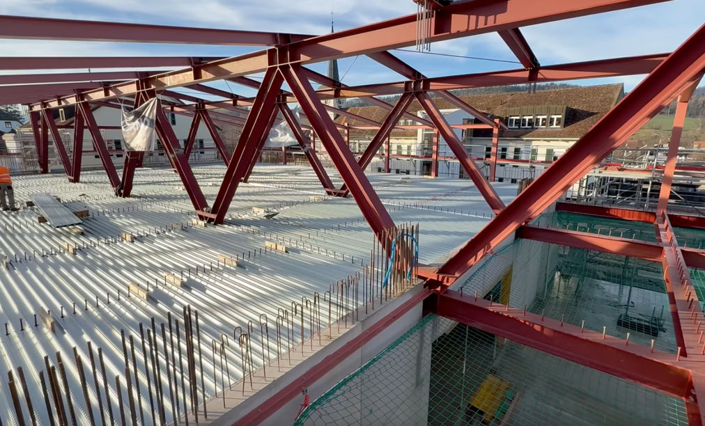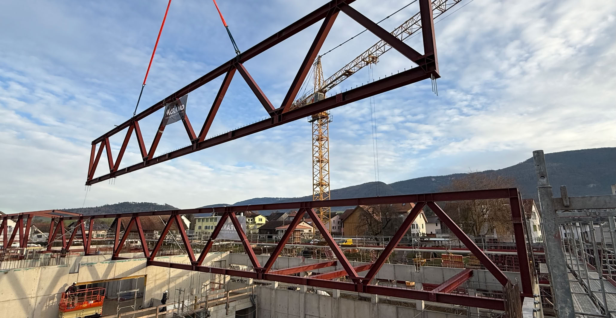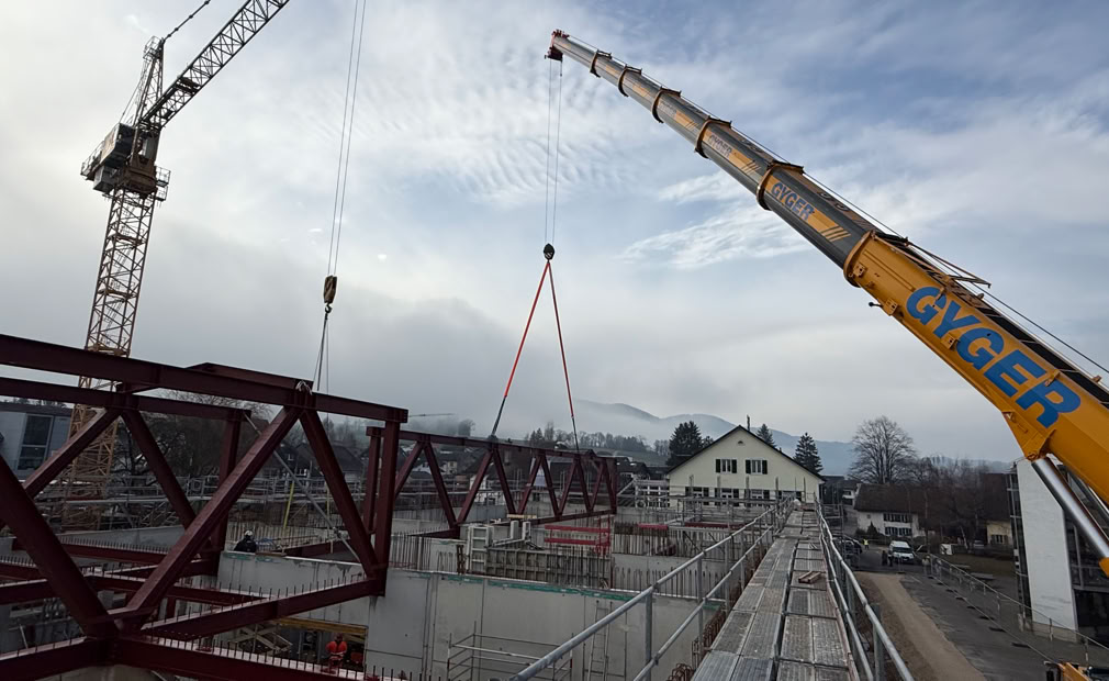 Les impressionnantes poutres métalliques du nouveau complexe scolaire ont été posées sur les murs porteurs du bâtiment. Pour cette opération spectaculaire, l’entreprise Gyger a mobilisé l’une de ses plus grandes grues, équipée d’un mât télescopique culminant à 85 mètres. Capable de soulever jusqu’à 450 tonnes, l’engin a manœuvré avec une précision remarquable, permettant notamment de déposer sans difficulté les deux poutres principales de 20 tonnes qui couvriront la double salle de sport.