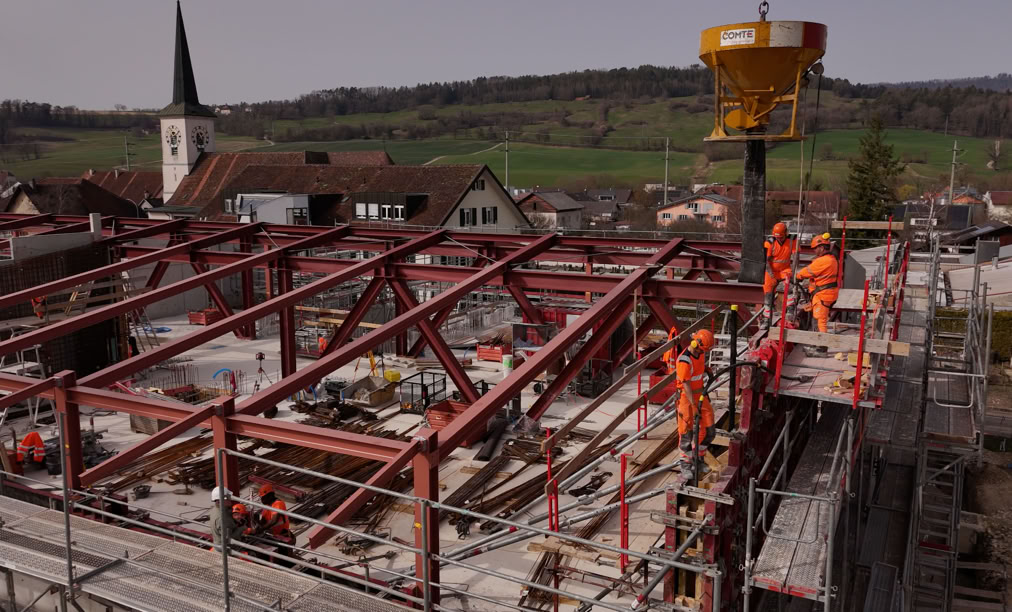 La direction des travaux joue un rôle clé dans le suivi et la coordination d’un chantier. Son mandat consiste à veiller à ce que les travaux soient réalisés conformément aux plans, aux normes, aux délais et au budget préalablement définis. Le bureau d’architecture zurichois Ken Architekten AG, responsable du projet, a choisi de déléguer la coordination et la supervision des travaux au bureau delémontain Arches 2000. La présence d’une entreprise de la région, proche du site, offre plus de réactivité et peut éviter les blocages administratifs.