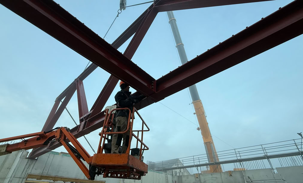 Malgré le renforcement des équipes durant l’été, le chantier a pris quelque retard. Les fortes pluies du printemps, la complexité des raccords entre la structure béton et l’imposante ossature métallique, la conception étanche des murs en béton, réalisés en continu, ont ralenti le rythme d’exécution. Afin d’éviter les éventuelles infiltrations d’eau provenant de la nappe phréatique toute proche, la jonction étanche entre les murs et la cuve devait être garantie.