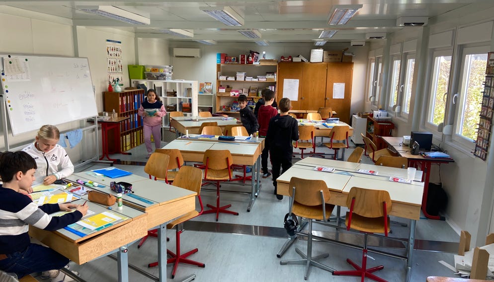 Toutes les classes qui se trouvaient dans la partie Sud du complexe scolaire ont été libérées car le bâtiment sera démoli au début de l’année prochaine. Les élèves se familiarisent avec leurs nouveaux locaux. La classe de 6e année s’est installée dans les containers (voir photo), une classe de 3e a trouvé refuge au Foyer Notre-Dame et les plus petits (1-2 enfantine) occupent une salle dans le bâtiment administratif où sont également données les leçons de co-enseignement. Le matériel qui n’a pas été déménagé (étagères, bancs, chaises, établis, etc) sera offert à la population le samedi 23 novembre. Prenez note !