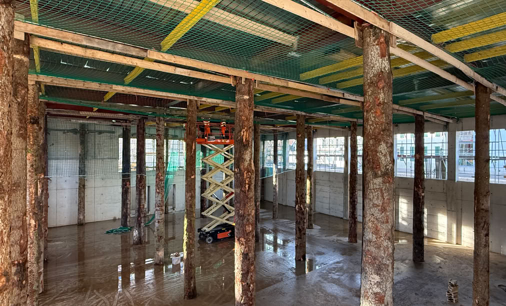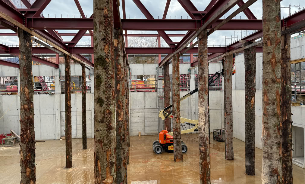 Le squelette du nouveau complexe prend forme. Les ouvriers profitent de ces douces journées de décembre pour terminer l’installation de la charpente métallique avant la fin de l’année. En attendant que la structure prenne toute sa solidité avec la réalisation de la dalle du premier étage en février prochain, la charpente métallique du nouveau complexe scolaire s’offre un soutien… très nature ! De robustes troncs d’arbres, tout droit venus de nos forêts régionales, veilleront fièrement sur l’édifice durant les fêtes.