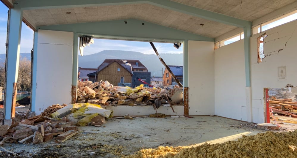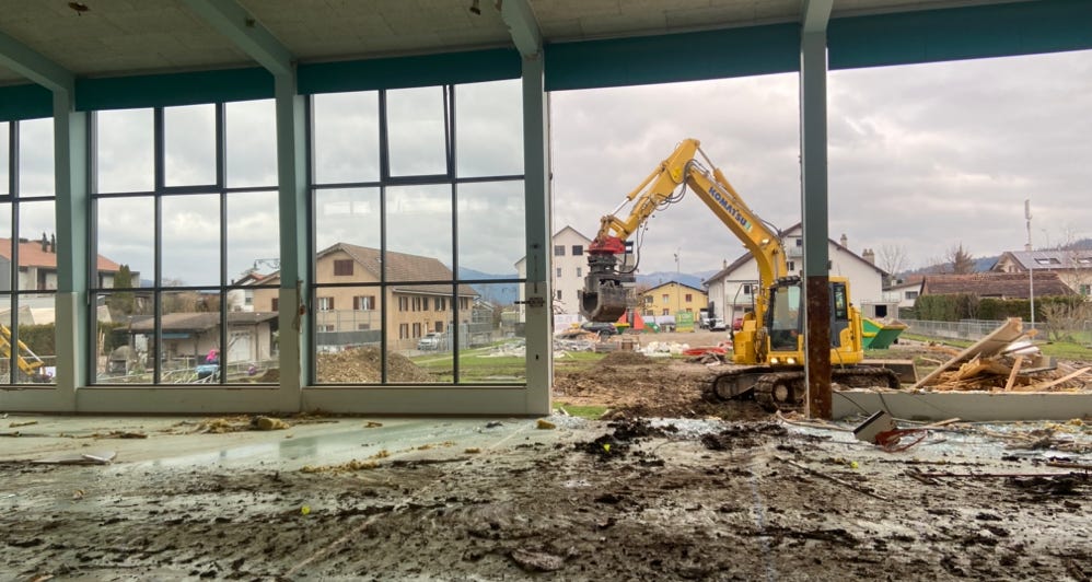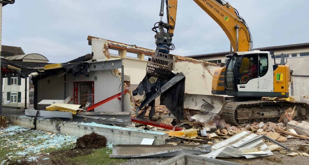 Un mois à peine après le début des travaux, le quartier de l’école est devenu méconnaissable. La démolition de la salle de gymnastique, menée de main de maître par les machinistes de l’entreprise Gobat SA, a été un des moments forts de cette fin d’année. Les travaux se poursuivront dès les premiers jours de janvier avec la démolition de l’aula et le début des forages géothermiques au sud du complexe scolaire.
