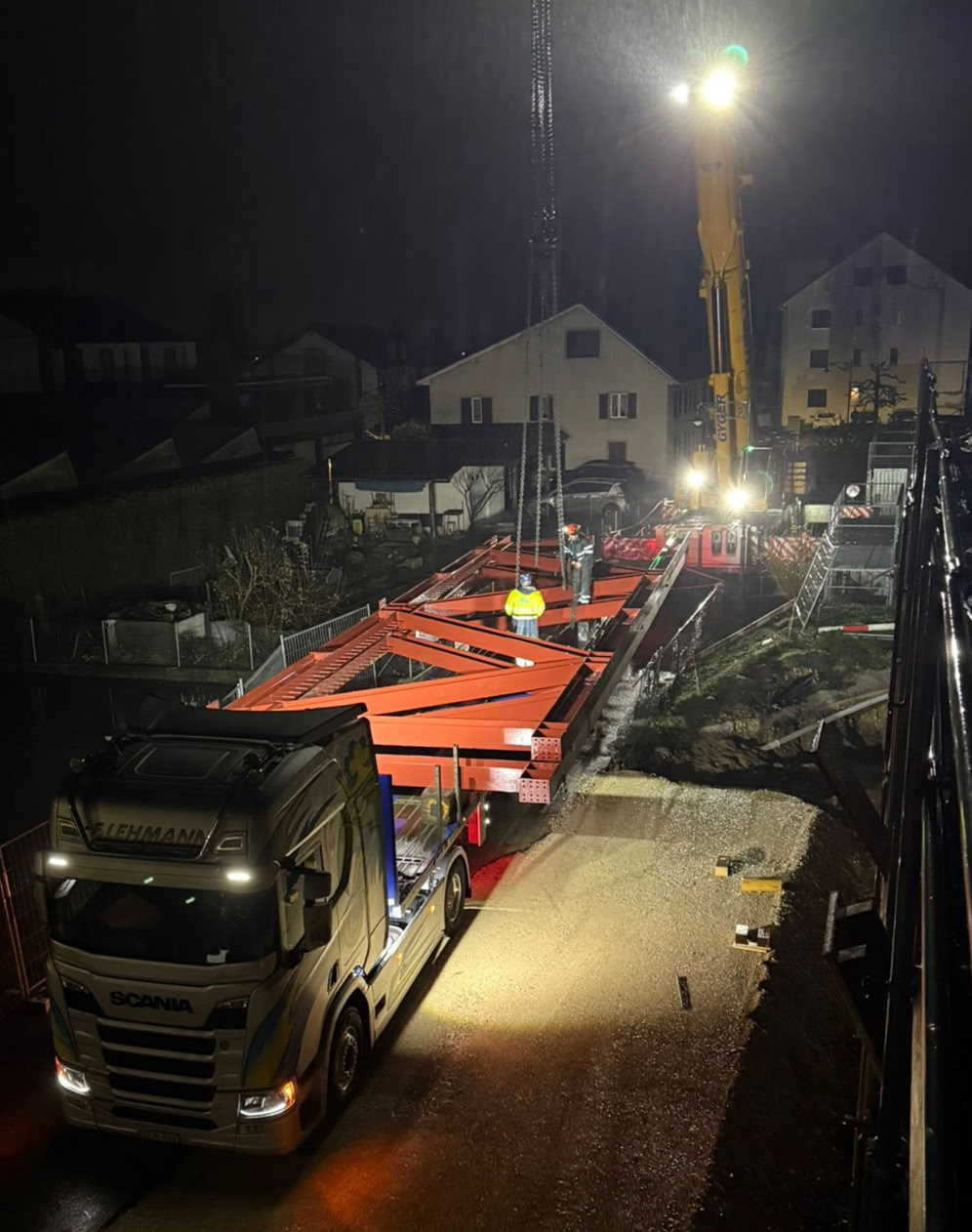 La structure métallique qui chapeautera le complexe scolaire est arrivée à bon port, au milieu de la nuit. Le convoi spécial qui acheminait les six grandes traverses a dû faire preuve de dextérité et de savoir-faire pour surmonter les nombreux obstacles qui se dressaient tout au long de sa route depuis le canton de Fribourg. La traversée des tunnels de l’A16 ne permettait pas le croisement des véhicules, la voie opposée a donc été fermée pendant le passage des trois camions. Les traverses seront posées sur les murs porteurs dès les premiers jours de décembre.