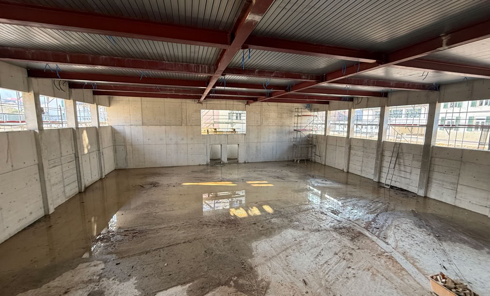 Grâce aux conditions météos particulièrement favorables, les ouvriers ont pu installer, avant les fêtes de fin d’année, une bonne partie des tôles d’acier profilées qui serviront de coffrage et d’armature du premier étage. Le volume impressionnant de la future double salle de gymnastique est désormais bien perceptible, permettant de se projeter concrètement dans les espaces qui accueilleront élèves, enseignants et sociétés du villages. Le premier étage accueillera les douze classes d’enseignement.