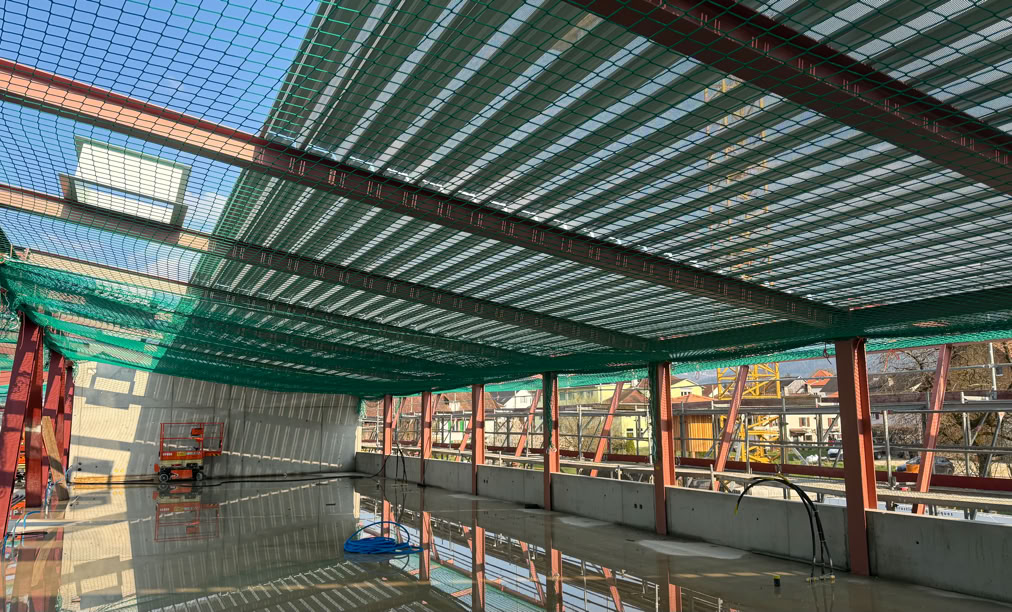 Les impressionnantes poutres métalliques du nouveau complexe scolaire ont été posées sur les murs porteurs du bâtiment. Pour cette opération spectaculaire, l’entreprise Gyger a mobilisé l’une de ses plus grandes grues, équipée d’un mât télescopique culminant à 85 mètres. Capable de soulever jusqu’à 450 tonnes, l’engin a manœuvré avec une précision remarquable, permettant notamment de déposer sans difficulté les deux poutres principales de 20 tonnes qui couvriront la double salle de sport.